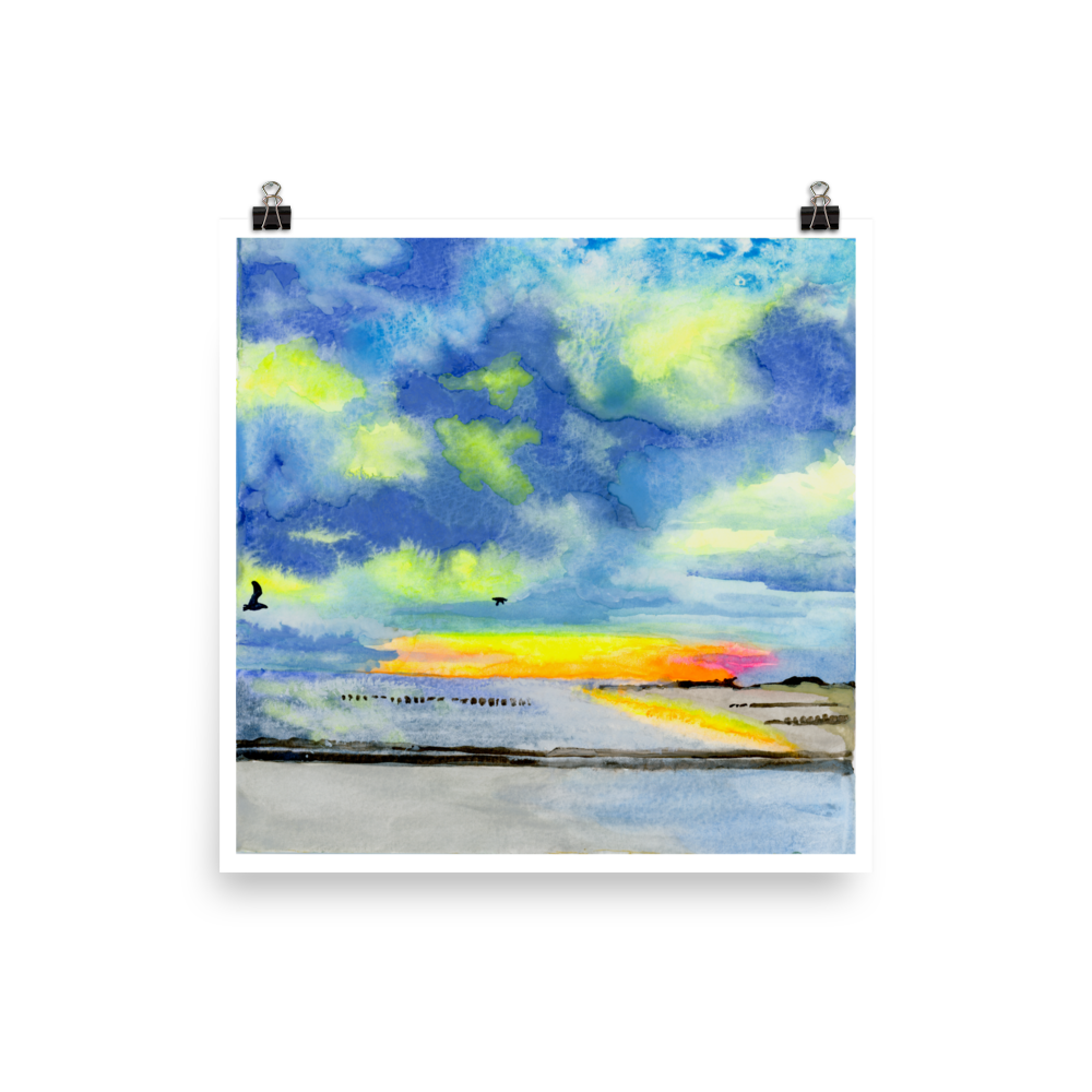 The Rockaways in winter — the beach stripped back to its essentials, the sky doing everything the summer crowds never stay long enough to see. Cold light, pale sand, the Atlantic holding its color at the horizon. A New York sunset that belongs to whoever shows up in February. Part of the Studies series — observational and personal works in watercolor and digital media.